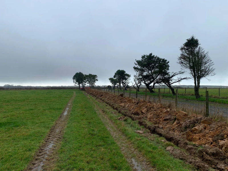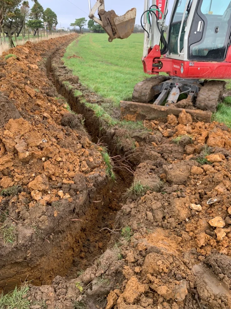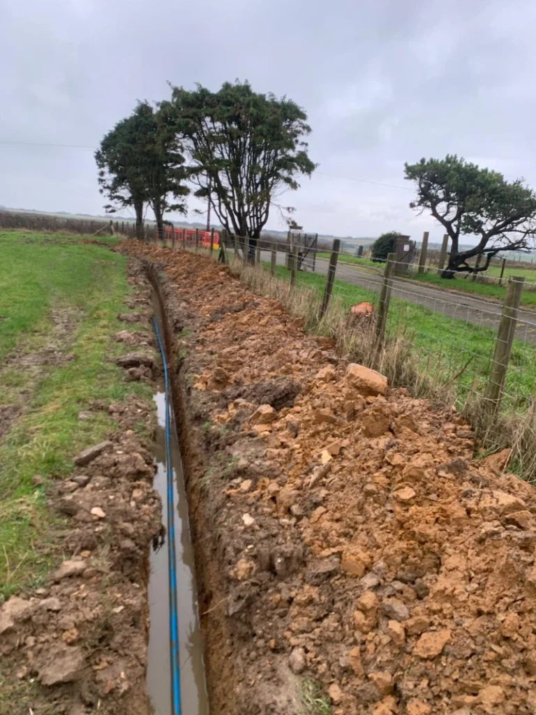 Excavate/trench 180 meters and lay a new poly pipe from the new water meter at the bottom of the road to the site building.