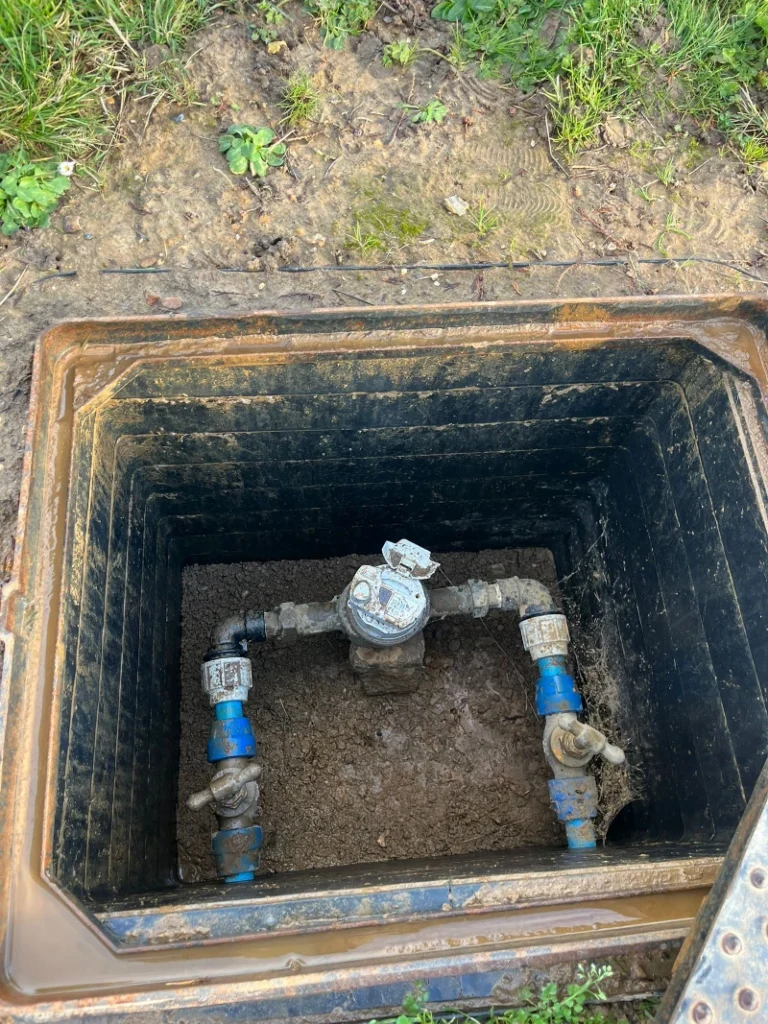 Carry out a site survey to investigate the water leak on the mains pipe between the new meter and pipe into the building.